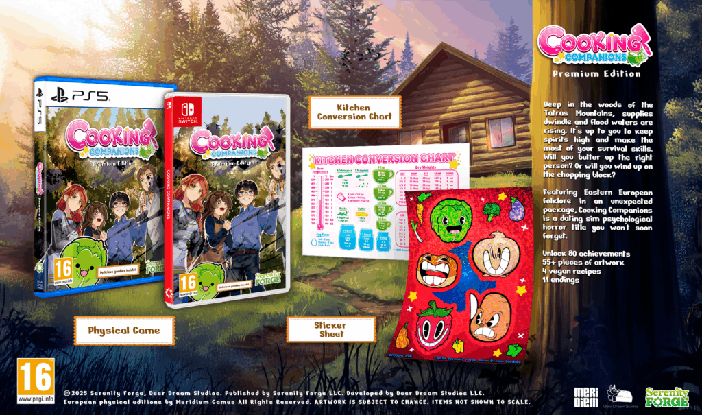 Serenity Forge et Meridiem sont heureux d’annoncer la sortie d’une édition physique premium de Cooking Companions, un roman visuel d’horreur psychologique touchant se déroulant au cœur des bois des Tatras. Développé par Deer Dream Studios et publié numériquement par Serenity Forge , Cooking Companions – Édition Premium sera disponible sur Nintendo Switch et PlayStation 5 le 2 décembre 2025.