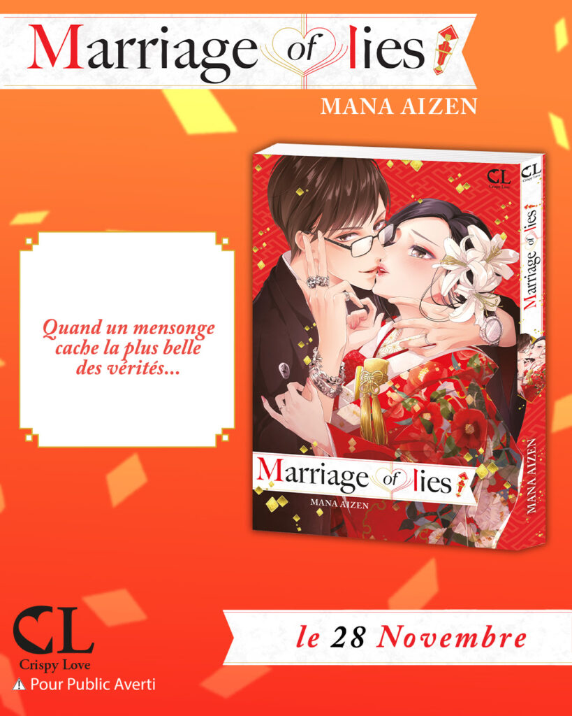 Fans de romance piquante et de secrets croustillants, marquez vos calendriers ! La collection Crispy Love est de retour en force le 28 novembre ! Et pour cette nouvelle vague, c’est l’autrice de talent Mana Aizen, déjà célèbre pour son titre Le prix de l’amour, qui nous fait l’honneur de dévoiler son tout nouveau one-shot : Marriage of lies !