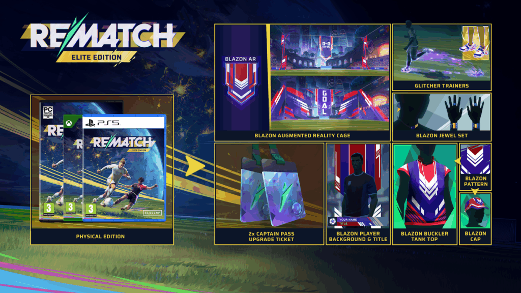 Conçu pour les joueurs passionnés, Rematch: Elite Edition inclut le jeu complet et le contenu exclusif suivant :