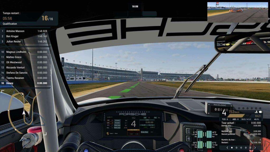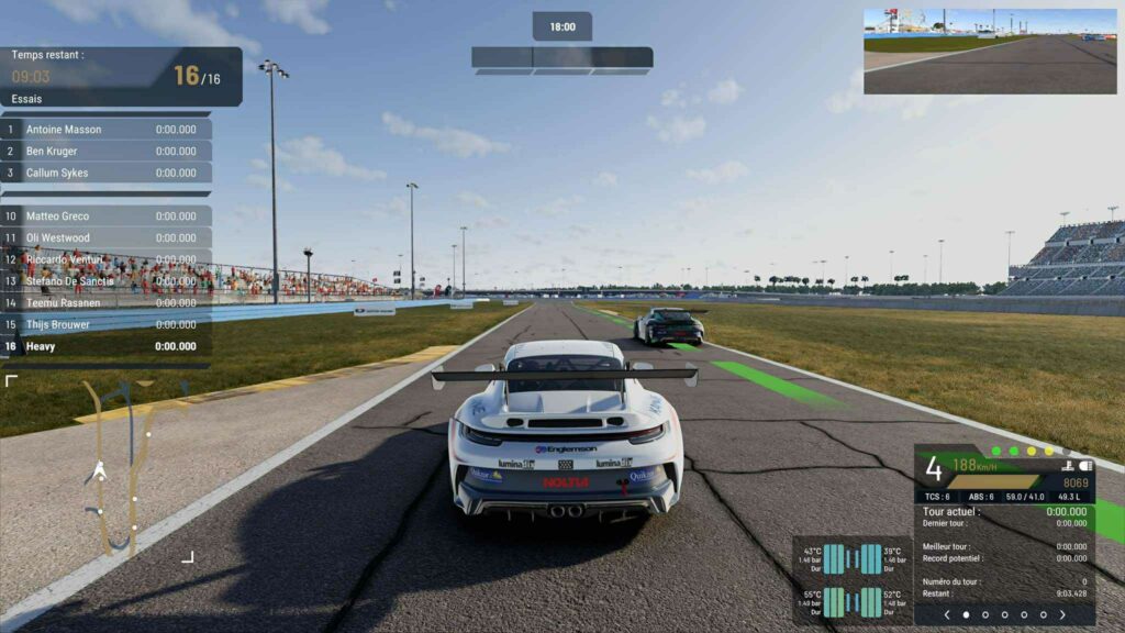 L’immersion sonore est traitée avec la même rigueur technique et sert véritablement d’outil de pilotage, surtout à la manette où l’information auditive compense l’absence de volant. Les sons moteurs sont viscéraux ; on entend distinctement le sifflement strident de la pignonnerie droite des boîtes de vitesses séquentielles et les claquements métalliques du châssis. Mais le plus impressionnant reste le travail sur les pneumatiques. Le jeu offre une gamme sonore nuancée pour les gommes : on distingue parfaitement le « scrub » (frottement) d’un pneu qui commence à glisser, du hurlement d’un blocage de roue complet. Côté ambiance, c’est stressant à souhait : le bruit du vent à haute vitesse est assourdissant, et le cliquetis des gravillons qui frappent le fond plat lorsqu’on mord sur un vibreur ajoute une texture sonore physique percutante.