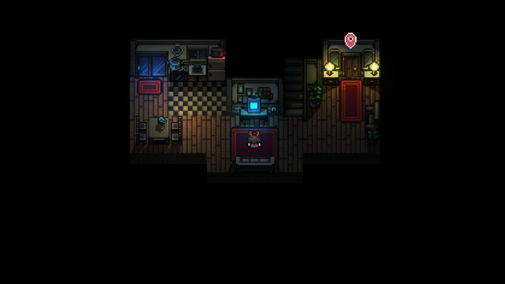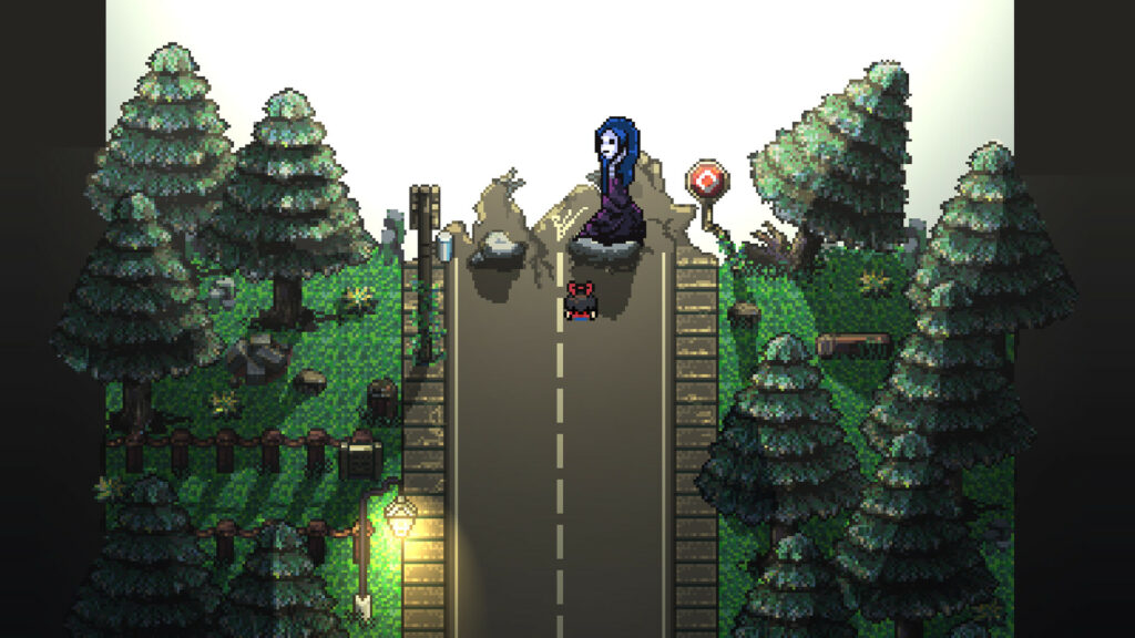 Dès les premières minutes, Red Bow: Strange Dream impose sa patte artistique singulière. Si vous êtes familier avec les travaux précédents du studio, vous retrouverez immédiatement cette esthétique pixel art en vue de dessus, qui rappelle l’âge d’or des jeux d’aventure 16-bits, mais avec une touche de modernité indéniable. La direction artistique est maîtrisée, offrant des décors à la fois colorés et profondément inquiétants. Le contraste entre l’apparence presque enfantine des personnages et la noirceur des thèmes abordés (suicide, mal-être, entités grotesques) crée un malaise constant et efficace. L’ambiance sonore n’est pas en reste, avec une bande originale inédite qui accompagne parfaitement l’exploration, oscillant entre mélancolie et tension pure. C’est propre, c’est beau, et cela prouve une nouvelle fois que le pixel art reste un vecteur d’émotion puissant lorsqu’il est bien utilisé.