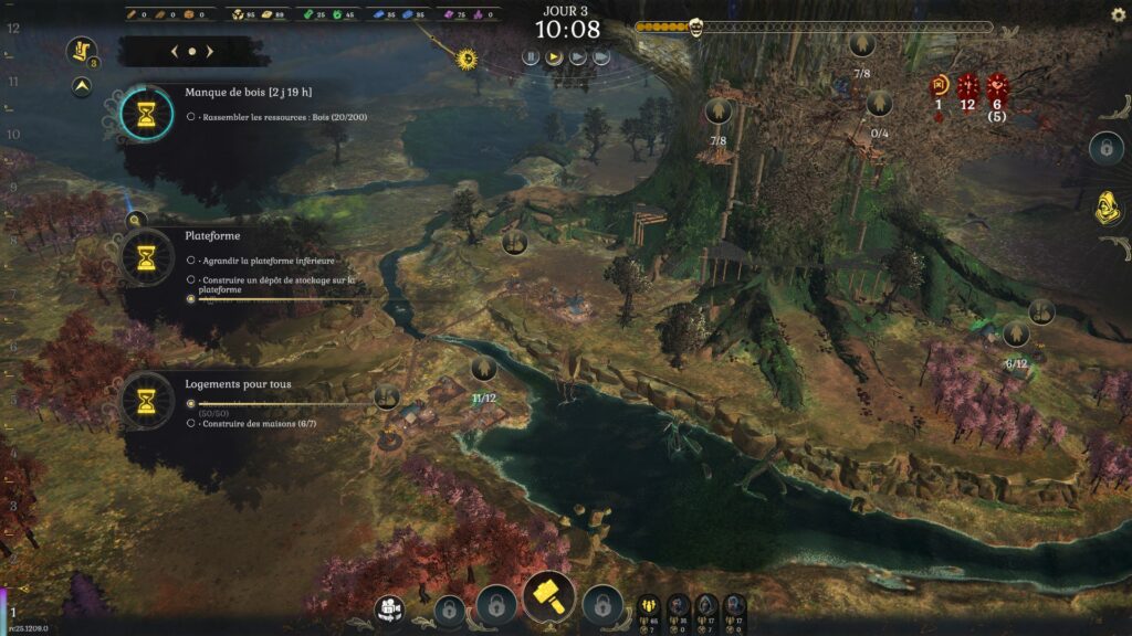 Cependant, tout n’est pas encore vert au pays des elfes. Si le concept séduit, l’exécution sur ce Playtest souffre d’un manque cruel d’ergonomie. L’interface, bien que stylisée, s’avère parfois illisible, et le tutoriel actuel jette le joueur dans le vide sans filet. La progression est freinée par un équilibrage encore brut de décoffrage, notamment sur la récolte du bois, désespérément lente, qui transforme certaines phases en une attente un peu morne. Le système de Tower Defense, censé pimenter les attaques de monstres issus de la brume, manque encore de réactivité et de clarté dans les retours d’informations.