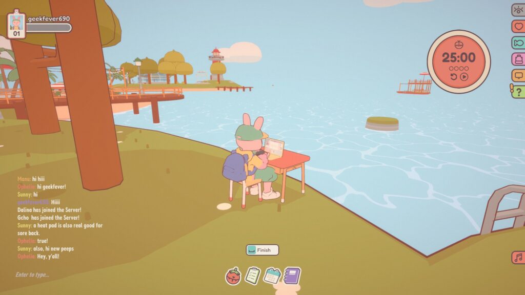 Côté utilitaire, OnTogether ne se contente pas d’être joli. Il intègre une suite d’outils de productivité basiques mais fonctionnels : une « to-do list », un journal et surtout un minuteur Pomodoro synchronisé. L’interface est pensée pour la flexibilité, permettant de réduire le jeu en une barre latérale ou en mode « sticker » transparent pour qu’il ne gêne pas votre workflow réel. C’est là que le titre tire son épingle du jeu : il réussit à être omniprésent sans être envahissant. Les phases de pause (les « breaks » du Pomodoro) incitent à lâcher son vrai clavier pour s’adonner à des mini-jeux simples comme la pêche ou le basket, ou simplement pour aller papoter autour d’un feu de camp virtuel. Ces interludes ludiques rythment la journée de travail et offrent une vraie coupure mentale, bien plus saine que de scroller infiniment sur les réseaux sociaux.