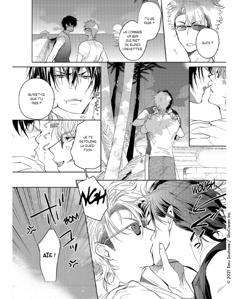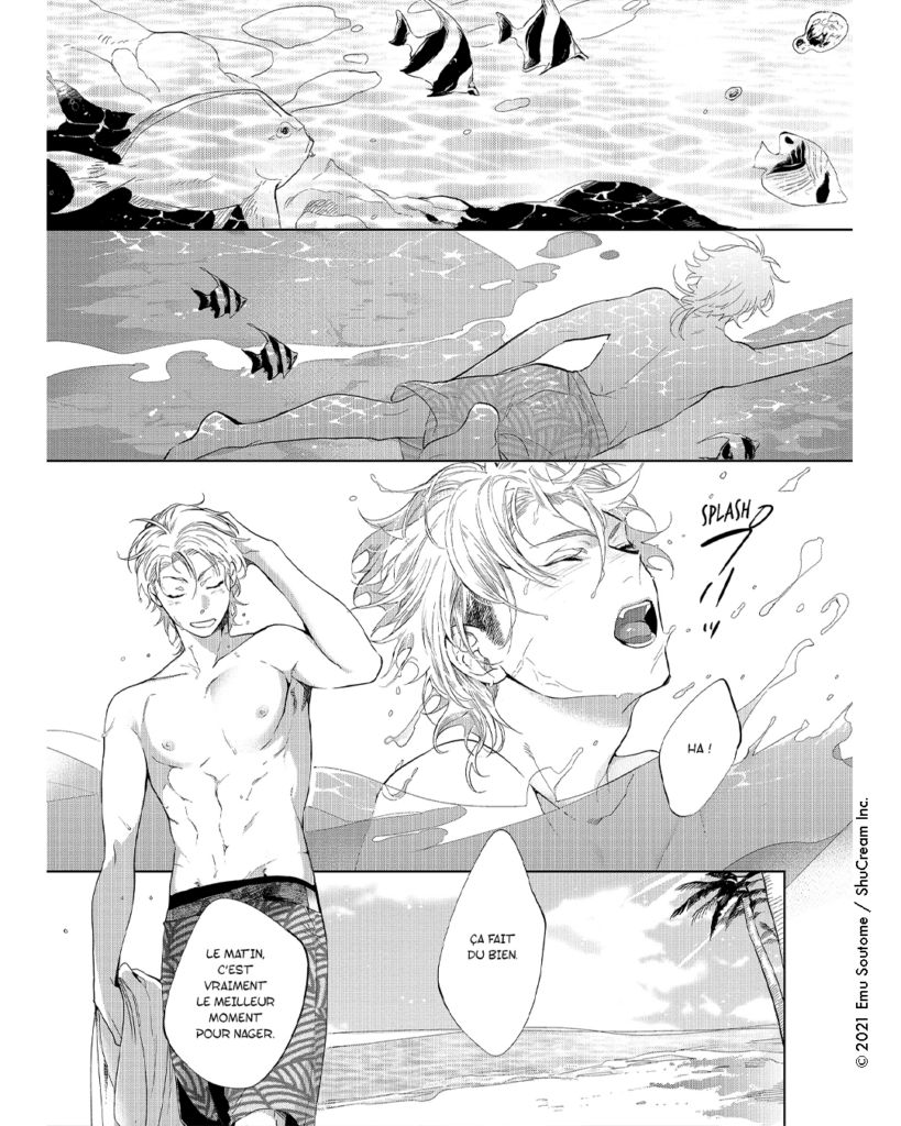 Emu Soutome confirme ici son talent pour mettre en scène des personnages aux forts caractères et à l’esthétique soignée. Par-delà l’égoïsme promet d’être un récit ultra-sexy, porté par un cadre paradisiaque qui donne déjà un avant-goût de vacances. C’est le rendez-vous idéal pour les amateurs de romances explosives où la tension physique est palpable à chaque page.
