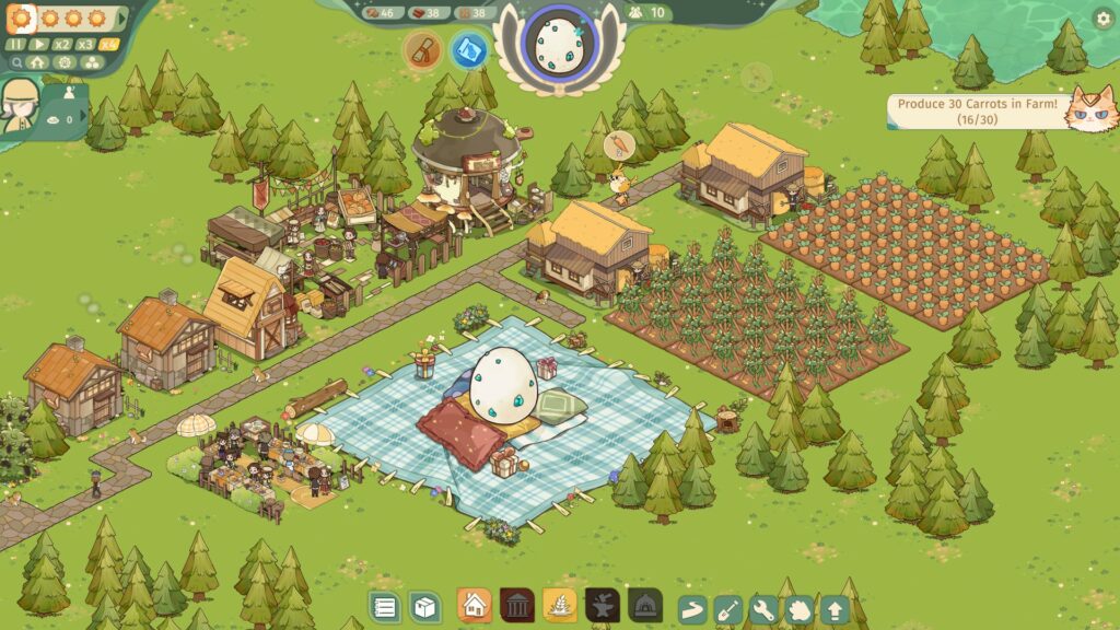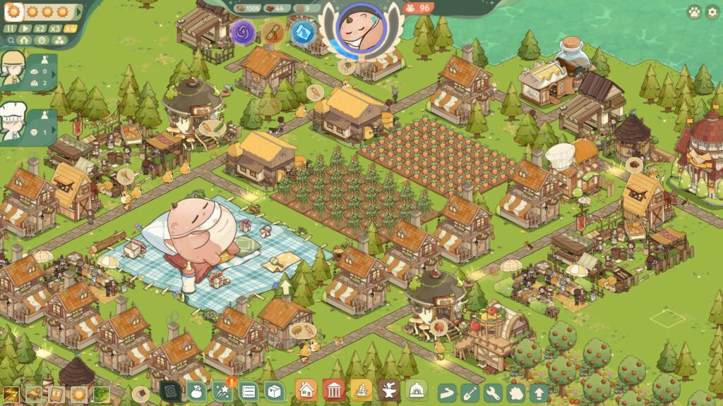 Développé par White Star Studio et édité par IndieArk, Feastopia est un city-builder culinaire mâtiné de roguelite qui s’inspire de mécaniques à la Against the Storm. L’histoire te met dans la peau d’un bâtisseur ayant signé un pacte sacré avec une divinité sous forme d’œuf tombé du ciel, que tu dois nourrir pour transformer une terre sauvage en une métropole gastronomique florissante.