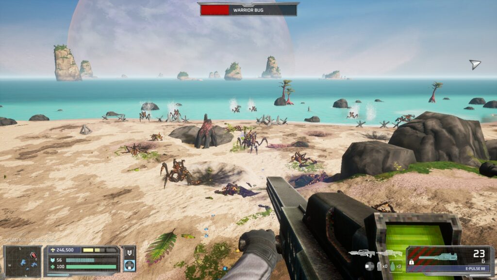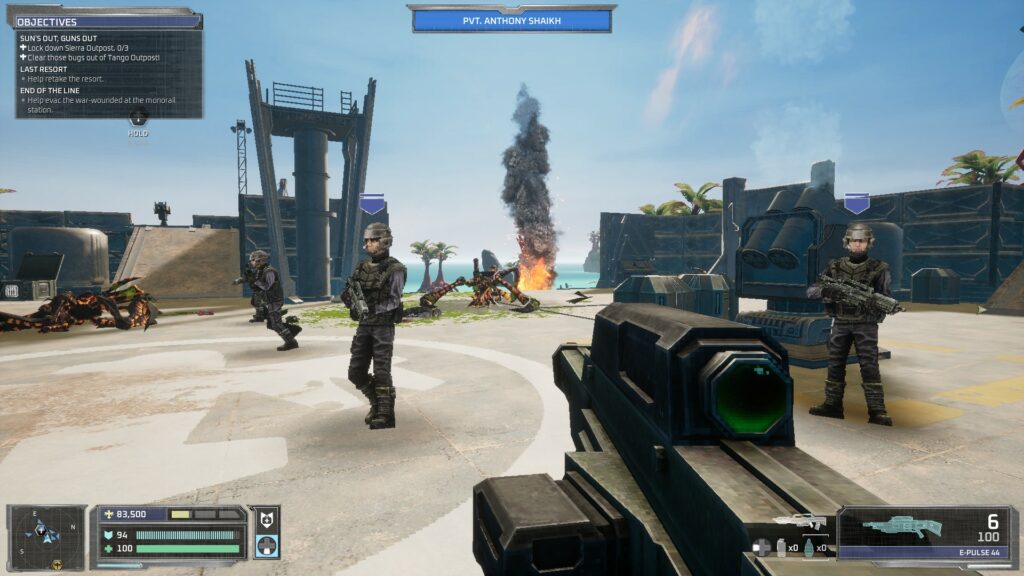 La structure des missions surprend par sa liberté : la carte de Zegema Beach est ouverte et non-linéaire, permettant de remplir les objectifs dans l’ordre de notre choix. On peut ainsi sécuriser des avant-postes, escorter des civils ou appeler des frappes orbitales pour nettoyer des zones entières. Cette approche « bac à sable » donne une vraie valeur de rejouabilité à la démo, car chaque incursion peut varier selon le chemin emprunté et les nids de bugs rencontrés.